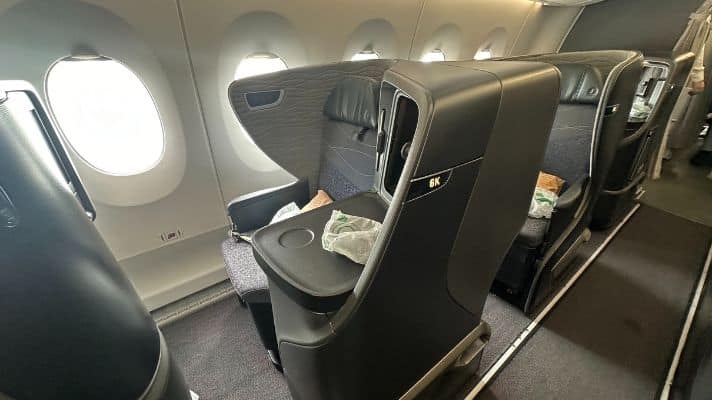 ビジネスクラスはこんなに広い椅子で、足の余裕も十分。